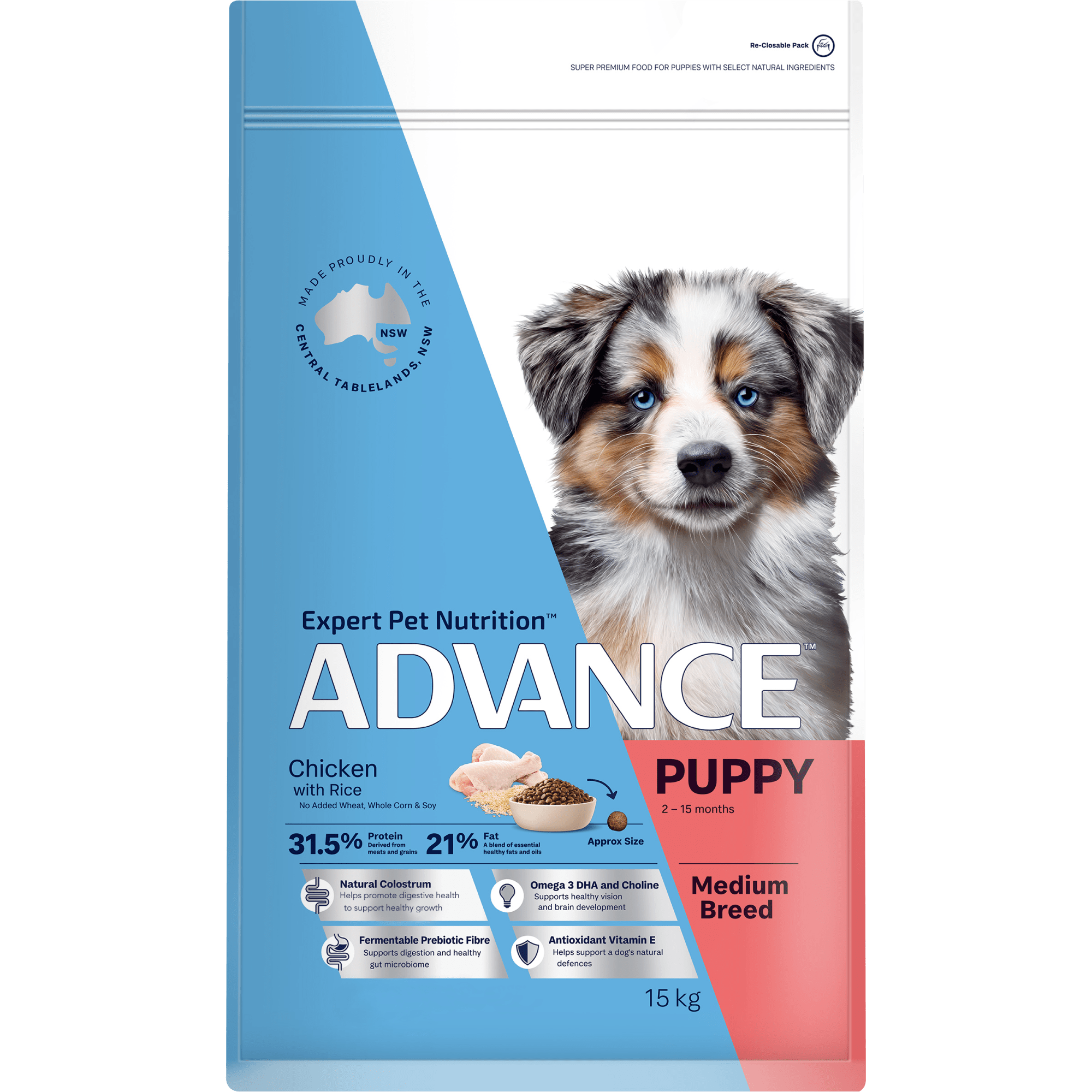 ADVANCE™ Puppy Medium Breed Dog Food provides complete & balanced nutrition for medium breed dogs by combining global science and select natural ingredients. Our formulas contain Fermentable Prebiotic Fibre to support healthy digestion and Omega 3 & 6 plus Zinc to maintain a healthy skin & coat.
